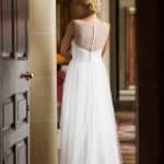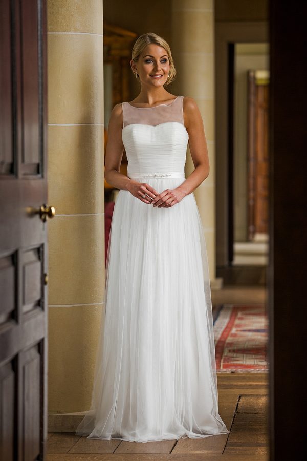 Swiss tulle dress with satin waistband. Beaded detail on waistband. Dargestellt in Elfenbein, auch in weiß.