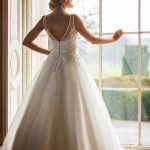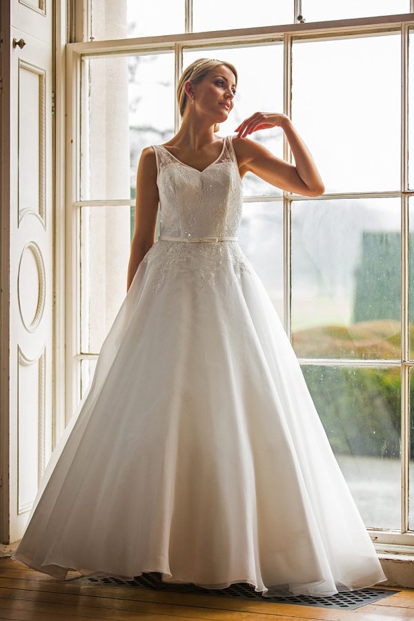 Organza und Spitzenkleid mit Satinbund. Dargestellt in Elfenbein, auch in weiß.