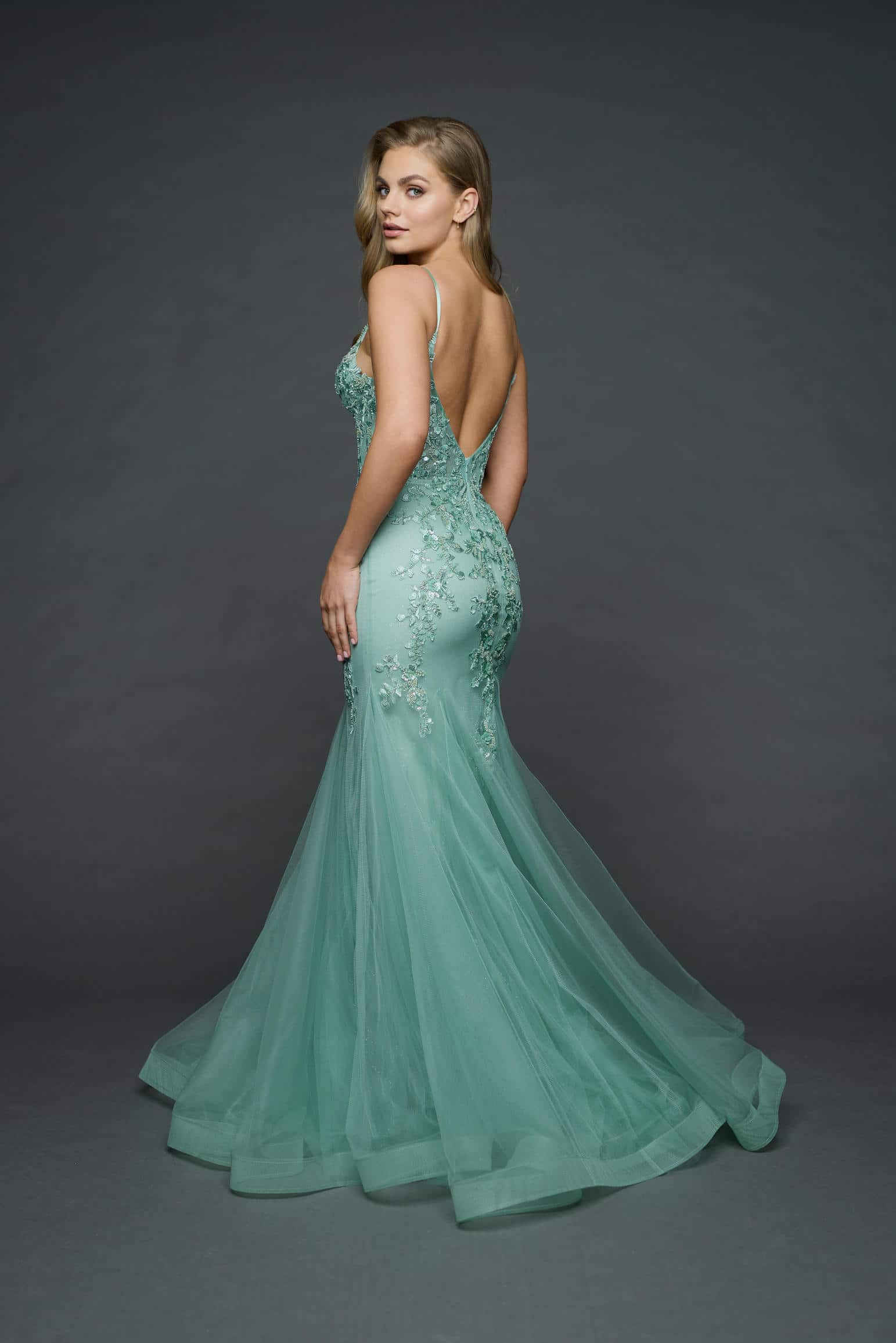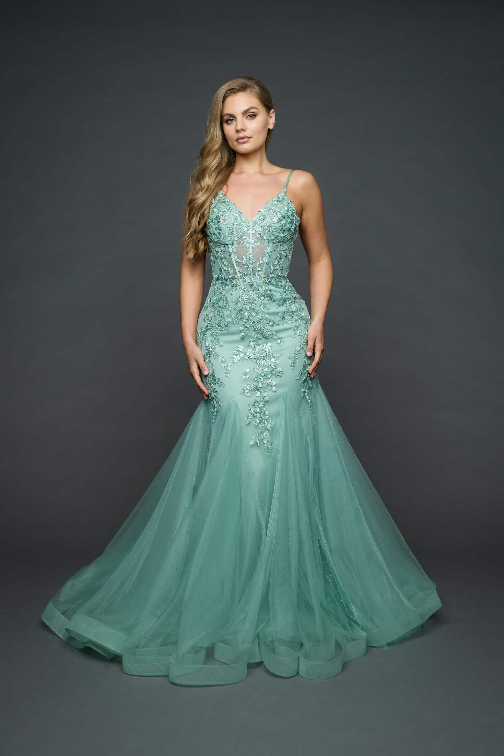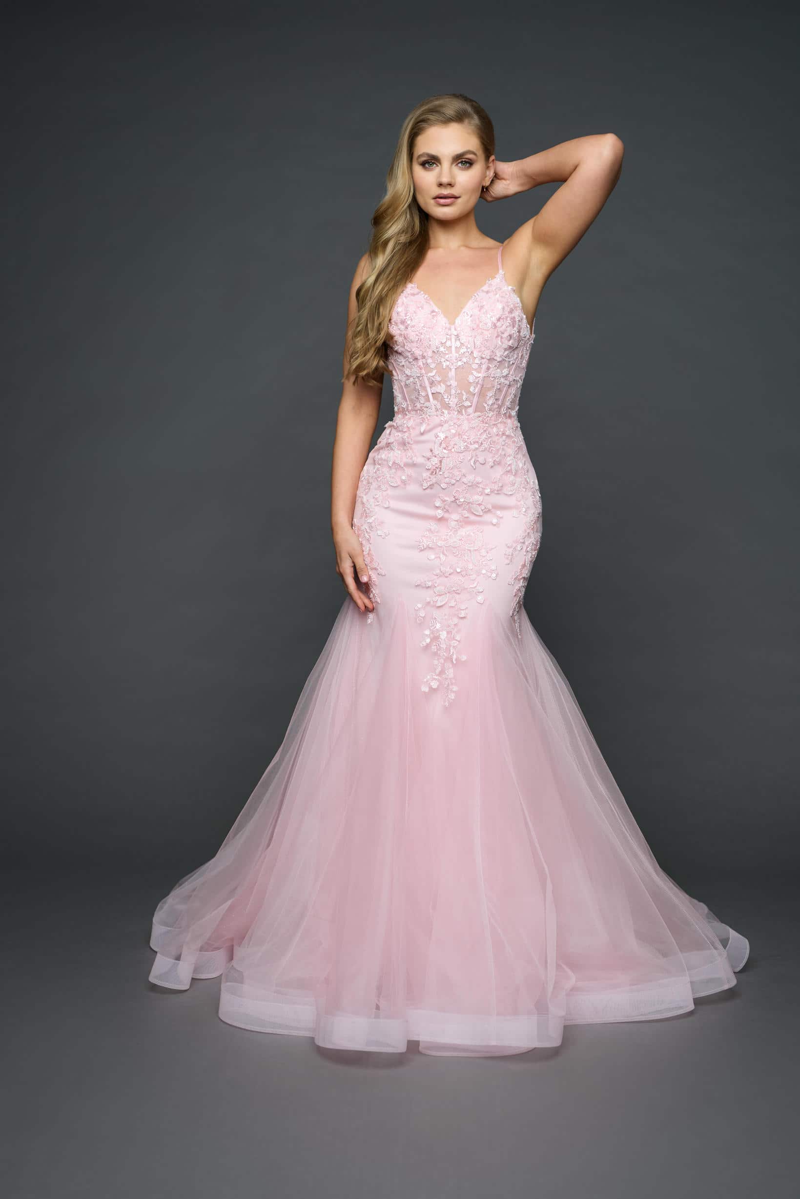 Boned lace bodice with sparkle tulle skirt.