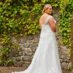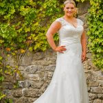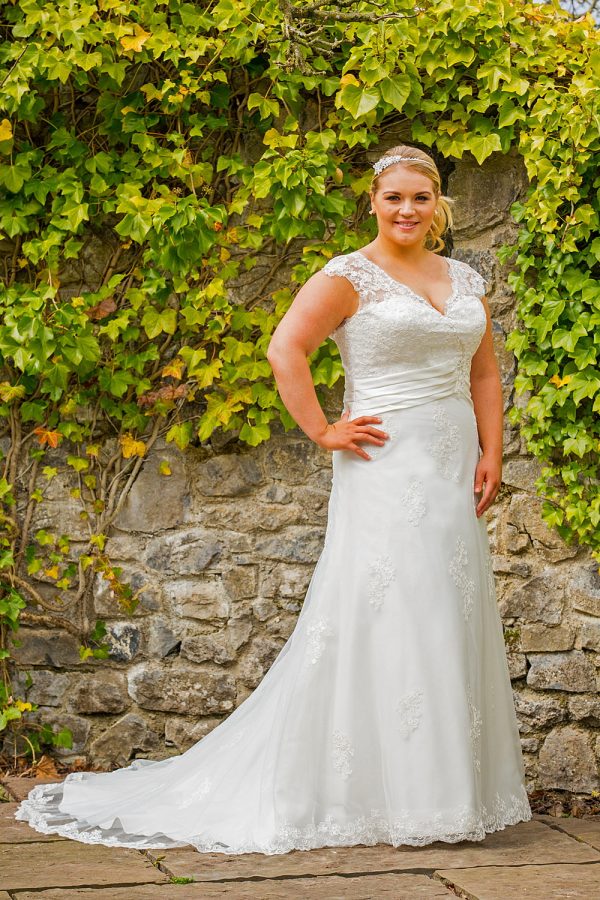 Maten UK 18-UK 36 Lace tulle dress with satin band at waist. Voorzien van korsetsluiting aan de achterkant. Getoond in ivoor / ivoor. Also available in ivory/blush, ivory/beige and white/white.