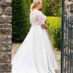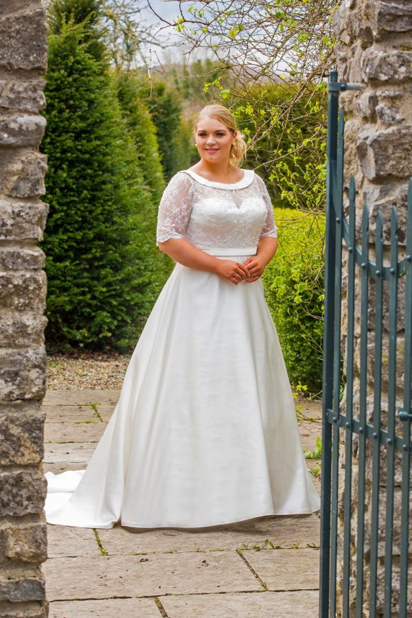Maten UK 18- UK 36 Jurk van kant en satijn met satijnen kraag. Met knoop- en lussluiting aan de achterkant van de jurk. Afgebeeld in ivoor, ook verkrijgbaar in wit.