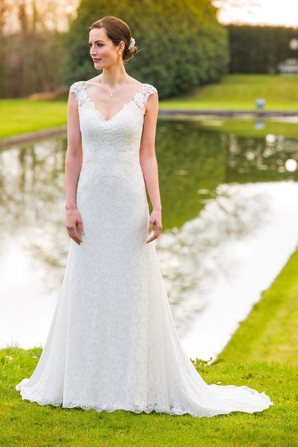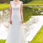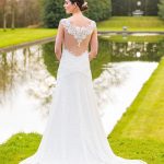 Stretch lace dress with appliqué lace on bodice .Features illusion back with appliqué lace. Shown in Ivory/Light Champagne, ook verkrijgbaar in wit.