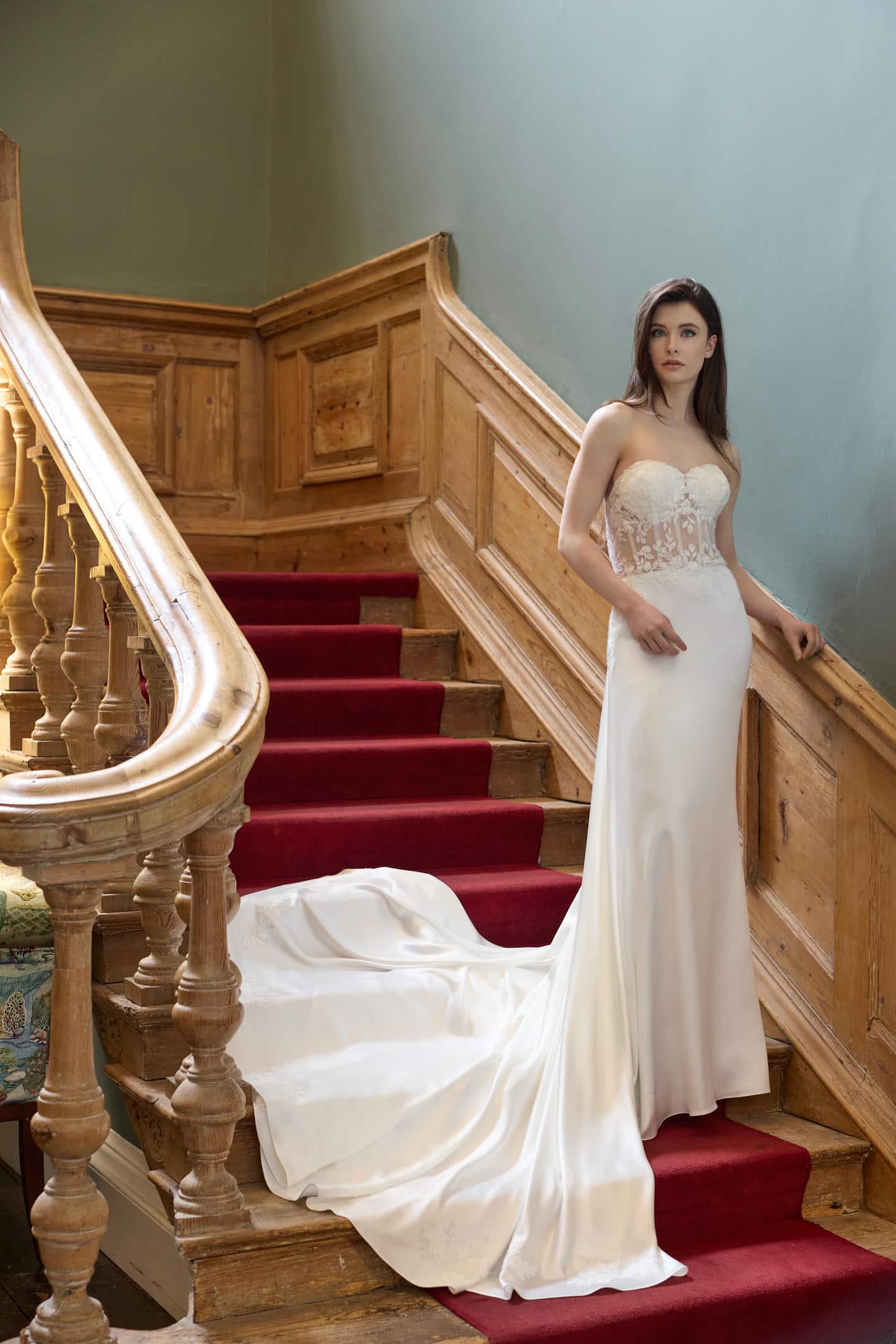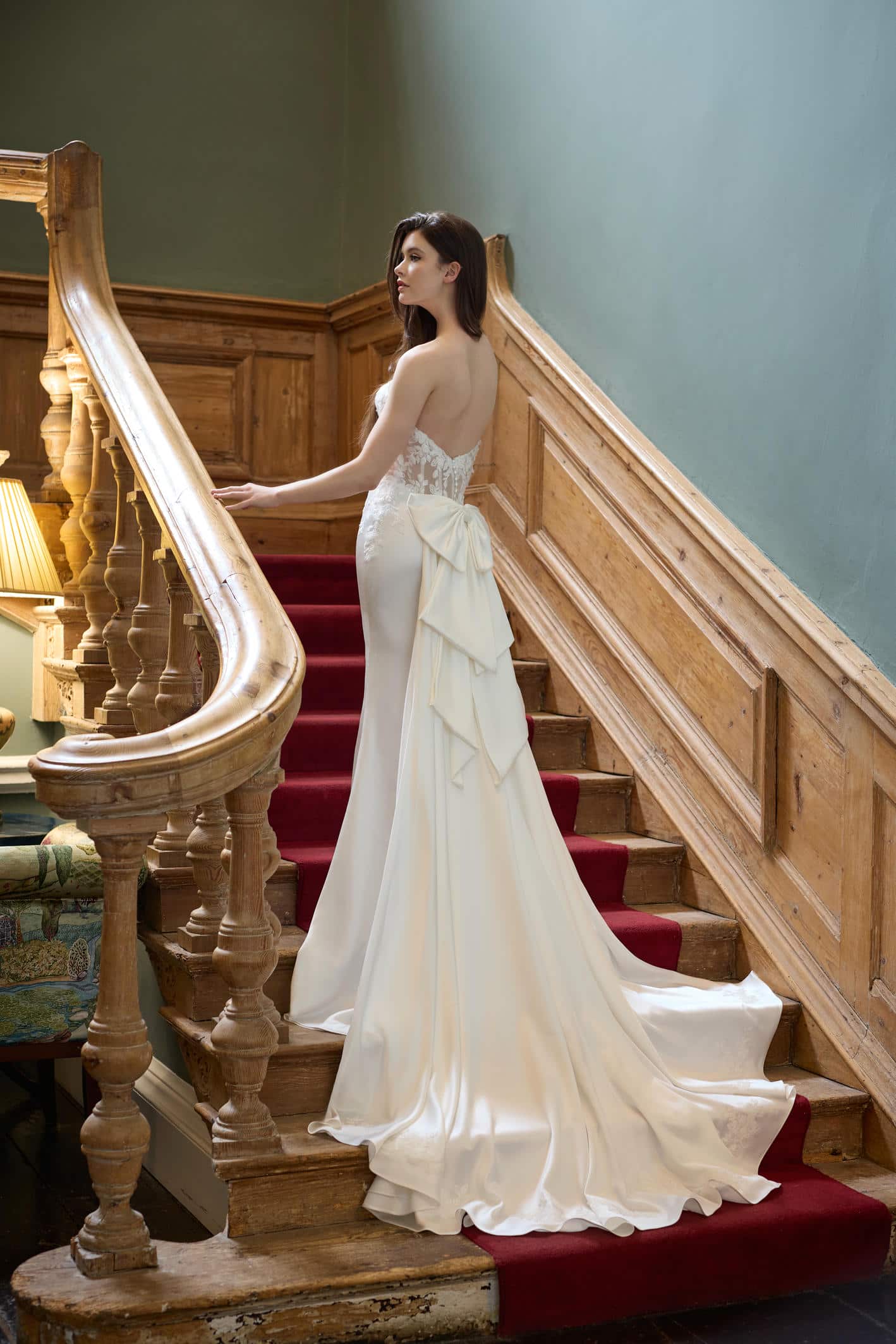 Lace Illusion Bodice, met een satijnenrok en een afneembare trein.