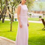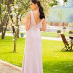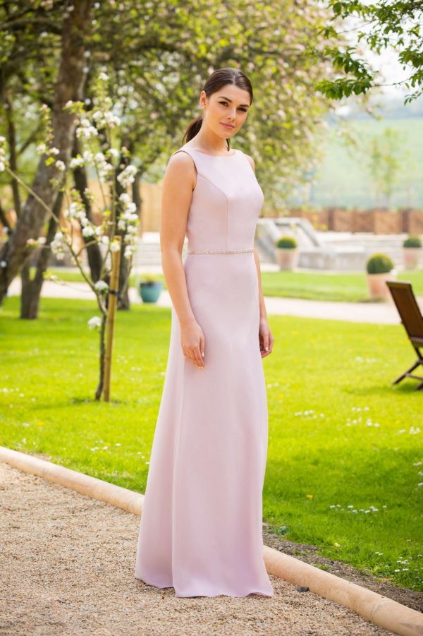 D20 925 UK6-UK36 chiffon jurk met diamonte knoppen aan de achterkant. Monster in abrikoos roze / zilver. Zie chiffon kleurenkaart.