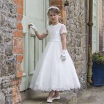 Jurk van tule van mikadozijde en kant met geplooide achterkant.