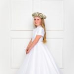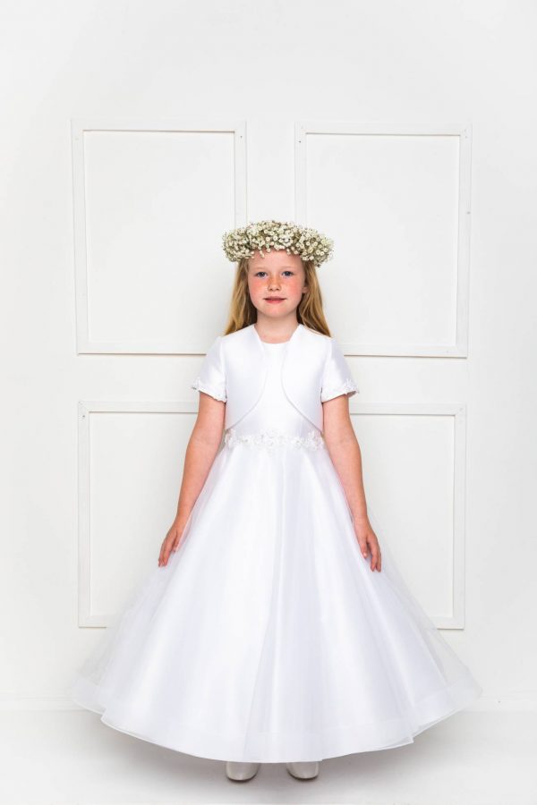 Mikado and tulle dress and jacket with beaded waist and sleeves.