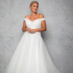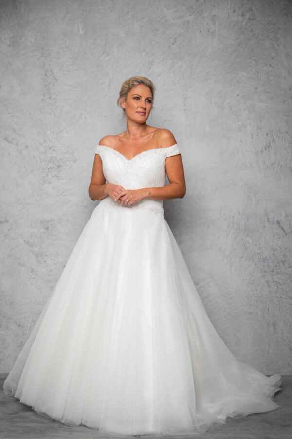 Rouched tulle beaded bodice with tulle skirt.