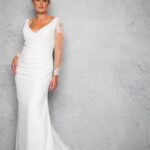 Crepe and lace dress with stretch lining.