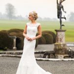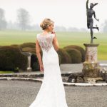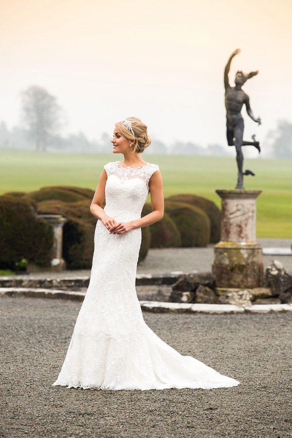 Beaded lace dress with cap sleeves. Features button and loop closure at back of dress with train. Shown in Ivory, also available in White