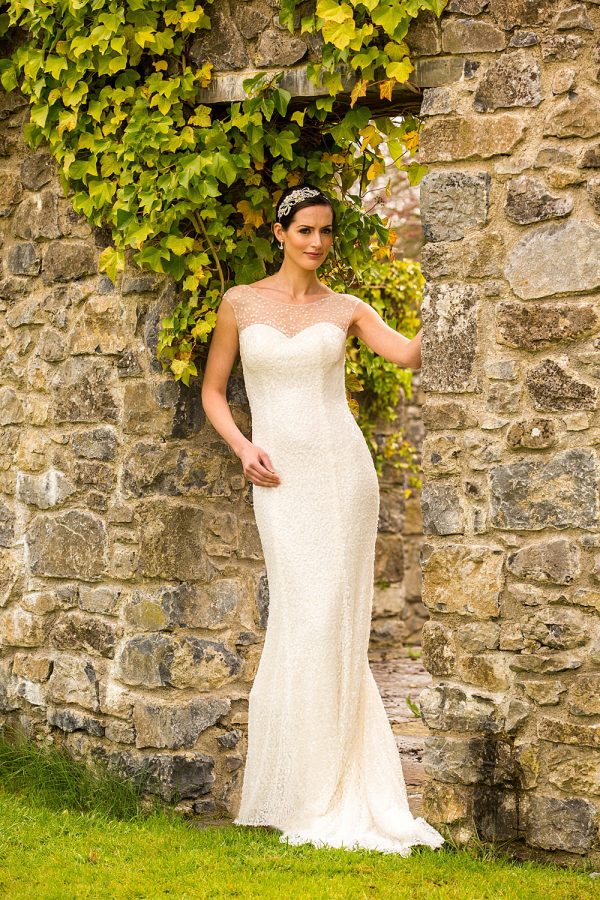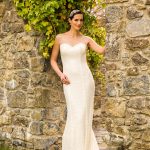 Beaded dress with sweetheart neckline and illusion top. Features button and loop closure at back. Shown in Ivory, also available in White.