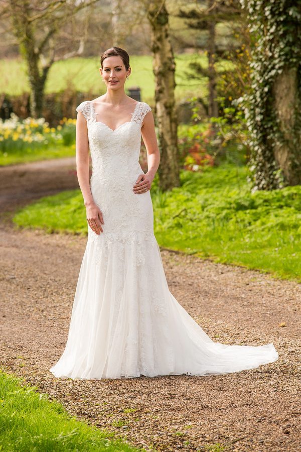Stretch lace and tulle dress with appliqué lace. Features illusion back with lace and button and loop closure at back. Shown in Ivory, also available in White.