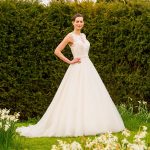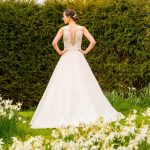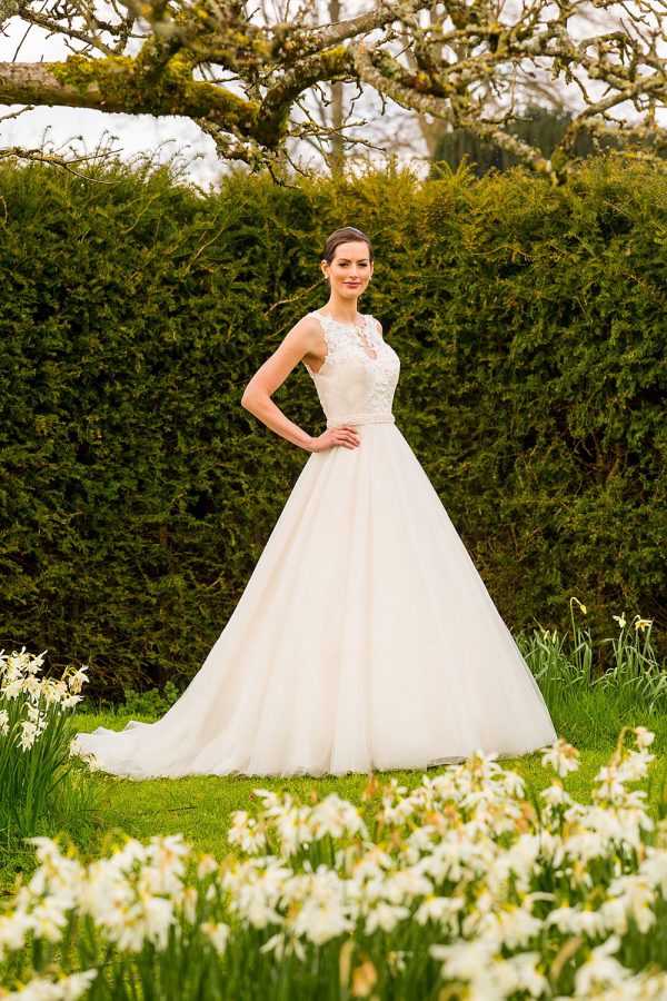 Lace and tulle dress with beaded band at waist. Features beaded detail on bodice. Shown in Ivory/Blush, also available in Ivory/Ivory and White/White.