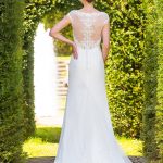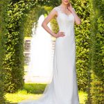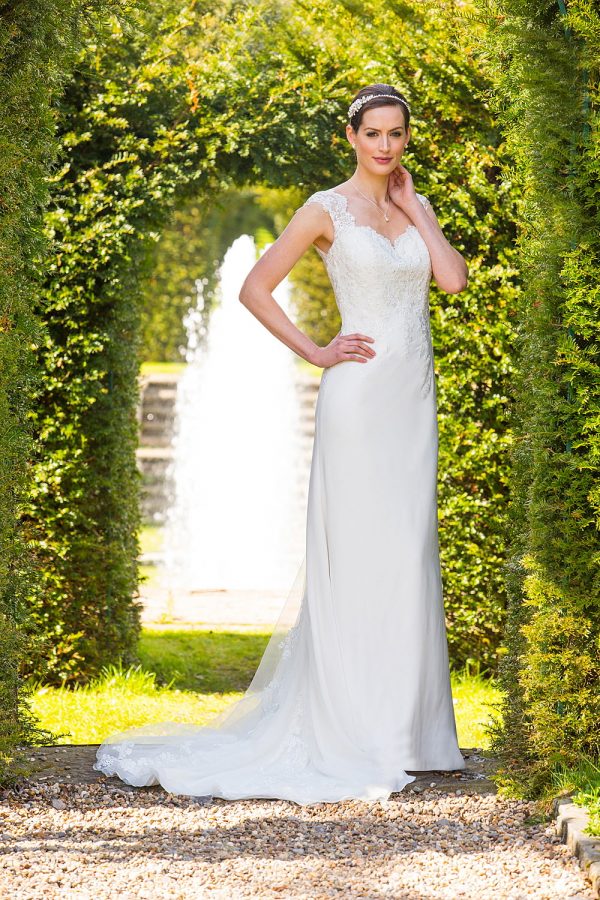 Lace and georgette dress with lace tulle train at back of dress. Shown in ivory. Also available in white.