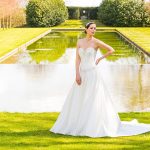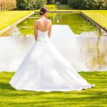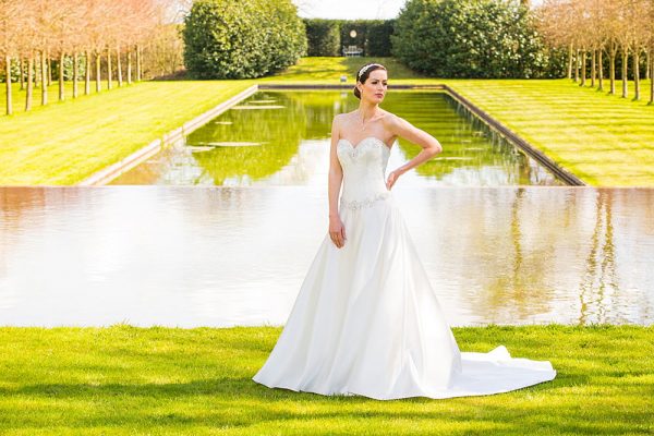 Lace bodice with full satin skirt. Features beaded detail on neckline and waist. Buttons down back of dress which continue into train. Shown in ivory. Also available in white.
