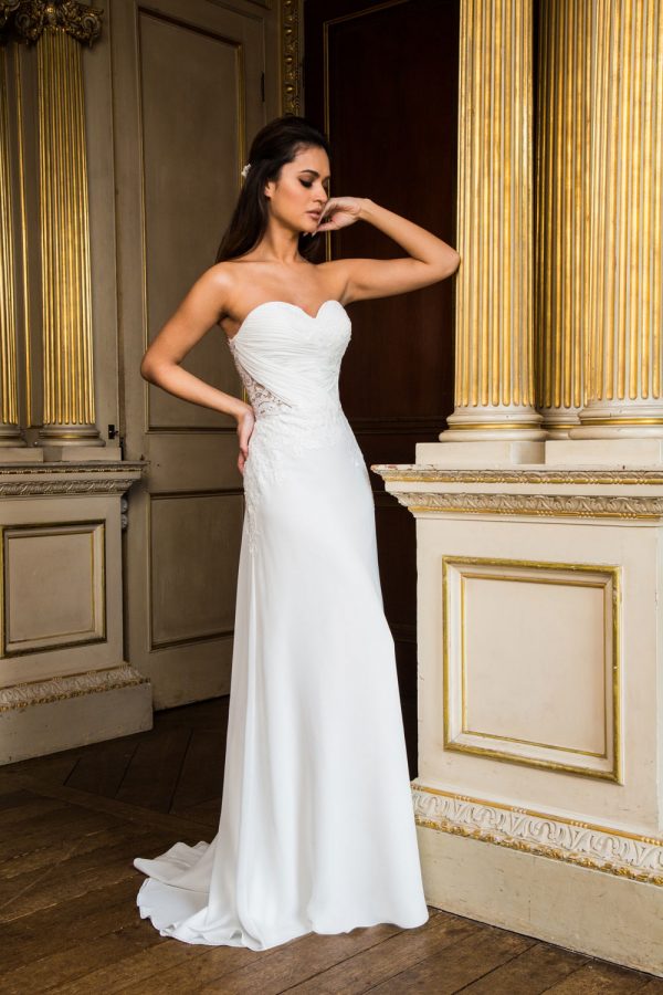 Size UK 6- UK 36 Chiffon and Lace dress with Sweetheart neckline Draping across the bodice Shown in Ivory also available in White