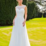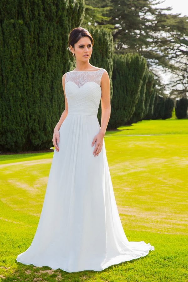 Size UK 6- UK 36 Chiffon Dress with lace Neckline Soft draping across the Bodice Shown in Ivory also available in White