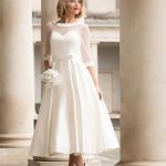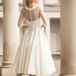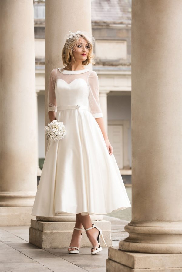 Size UK 6-UK 36 Satin Tea Length dress with stretch Tulle top and sleeve Shown in Ivory also available in White