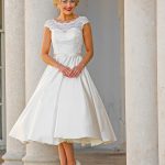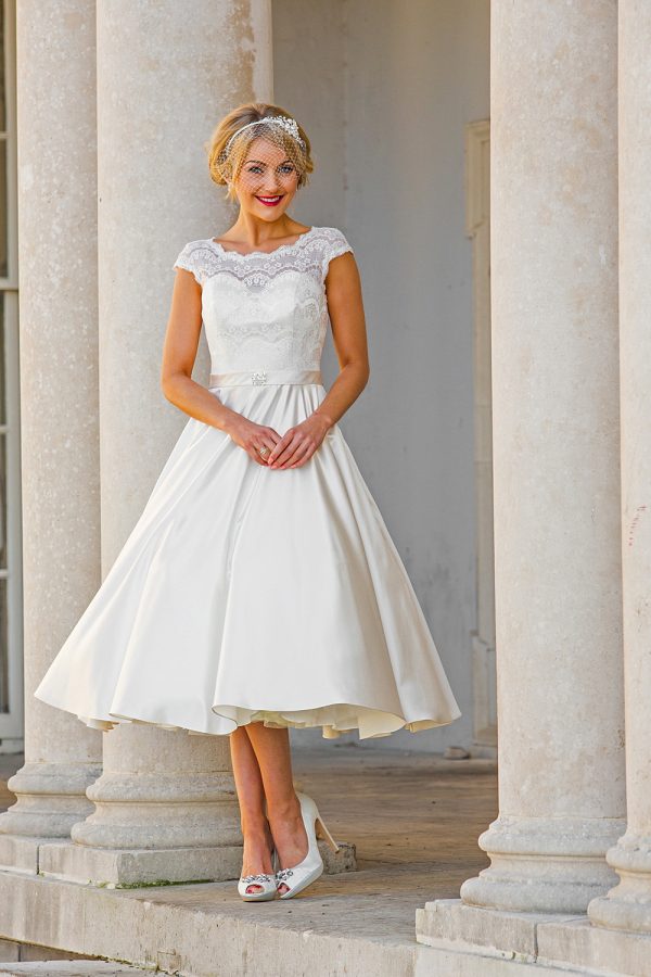 Lace and satin dress with diamante detail at waist. Shown in ivory. Also available in white.