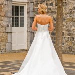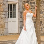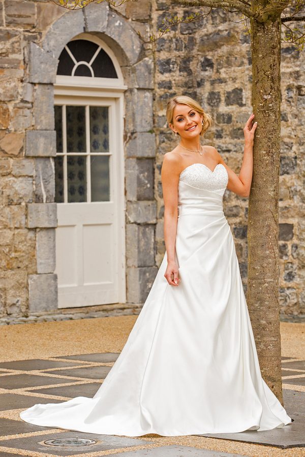 Satin dress with beaded bodice. Features wrap skirt at front and lace up back. Shown in ivory, also available in blush and white.