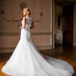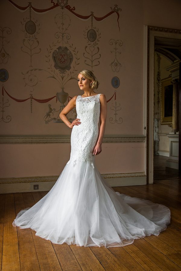 Lace dress with detachable full tulle skirt. Can be worn as a short dress when tulle skirt is removed (E17 813).