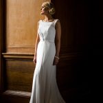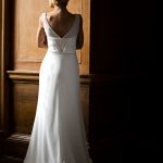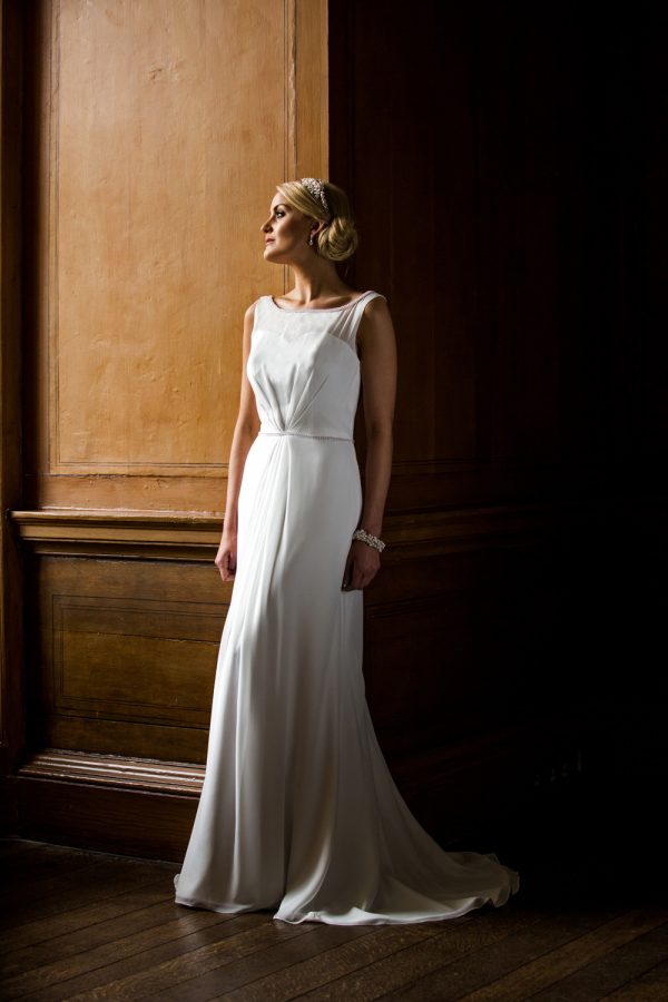 Chiffon dress with pearl beading at neckline and at waist. Shown in ivory, also available in white.