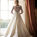 Lace and satin dress with satin collar and waistband. Shown in ivory, also available in white.