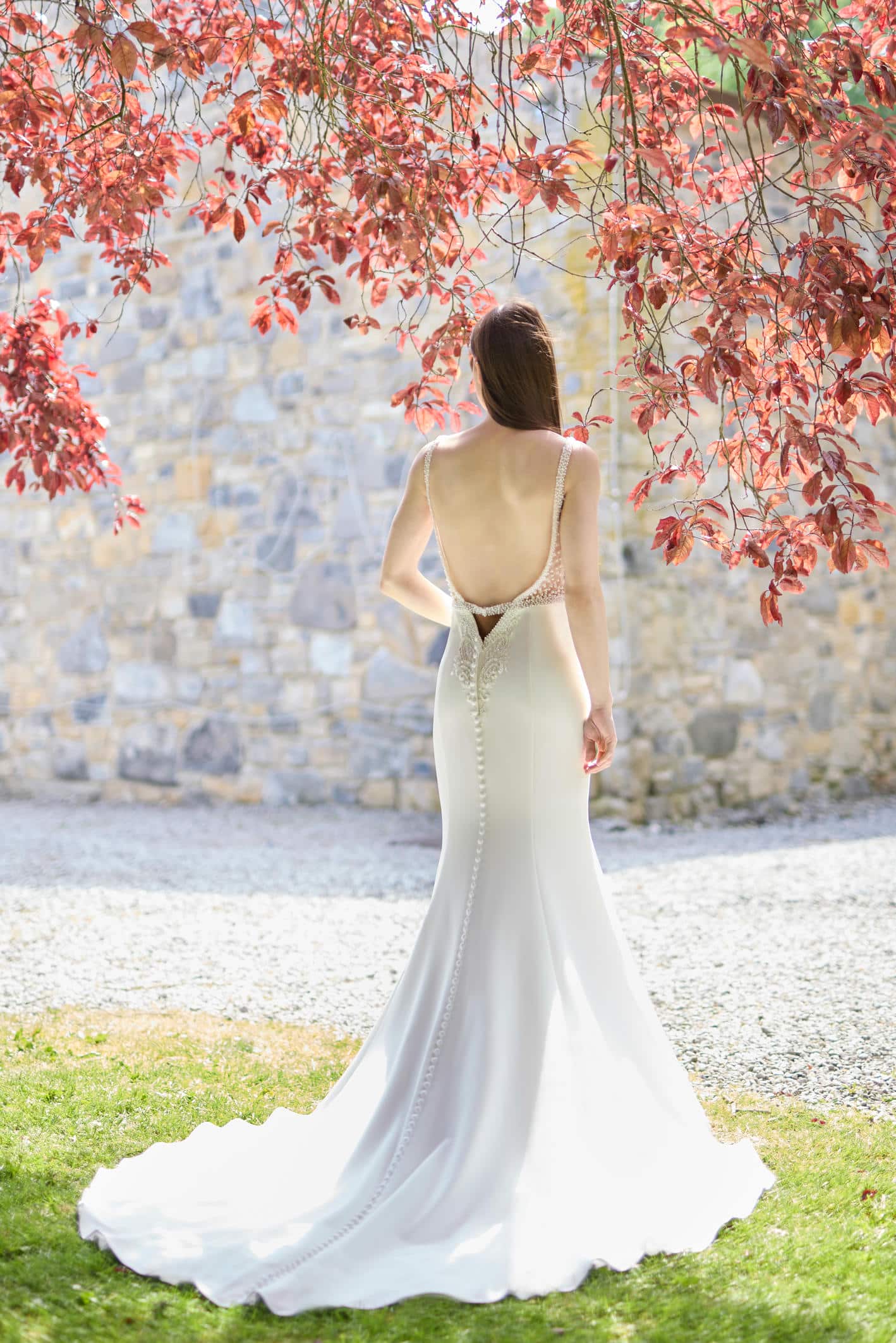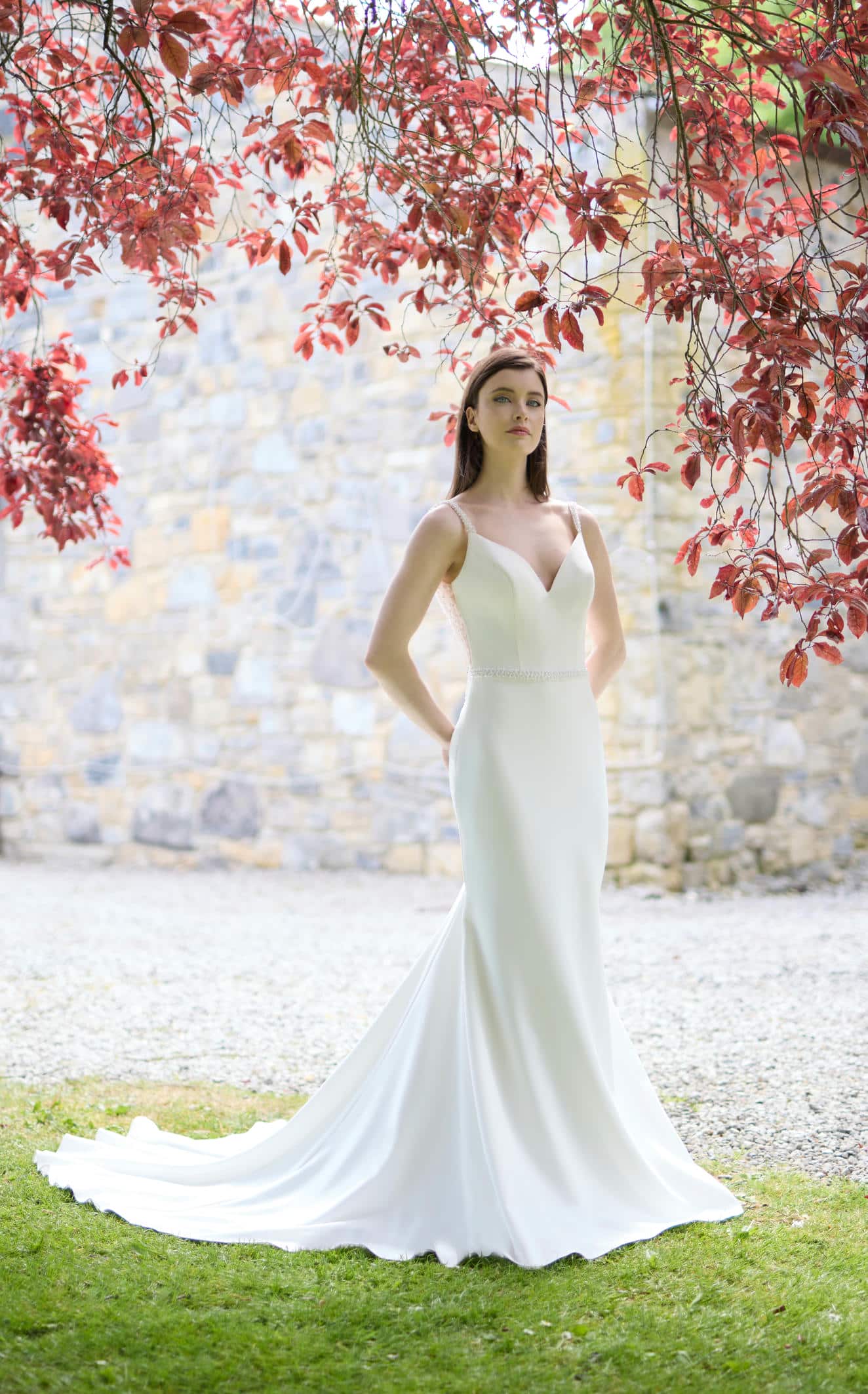 Crepe dress with beaded belt and back.